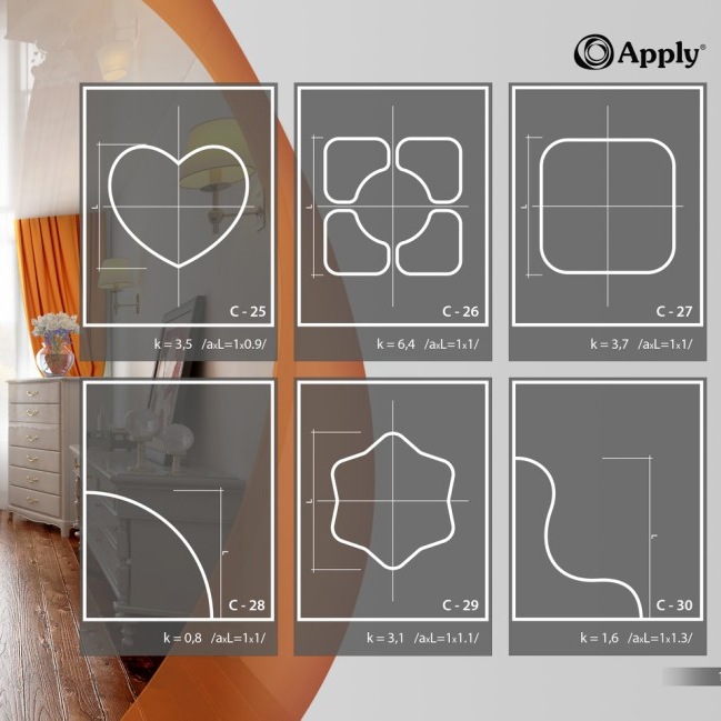 Шаблоны Apply - это уникальная возможноcть быстро и профессионально установить двухуровневый натяжной потолок. Они позволяют самостоятельно создавать красивые формы двухуровневого натяжного потолка. Это набор, состоящий из жестких деталей, соединяющихся в пазловый замок, создающий точную форму будущего потолка. По периметру собранного Вами шаблона, точно повторяя его конфигурацию, монтируется профиль. Готовую конструкцию крепите на потолке и монтируете полотно.