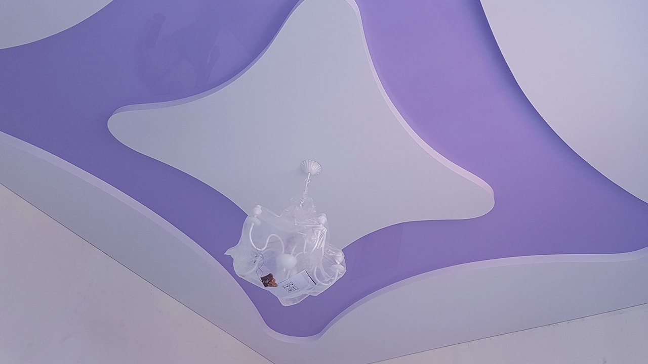 Состоит из двух индивидуальных шаблонов. Причем на сиреневом потолке для создания ниши с подсветкой использовался широкий 12 см шаблон